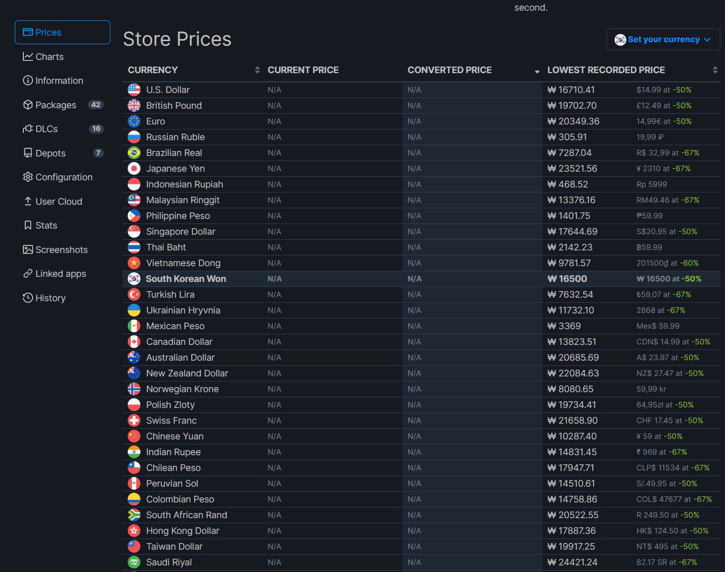 그러면 위와같이 나라별 가격, 현재 가격, 지금까지의 최저가가 얼마였는지 목록이 나와야 하는데..
