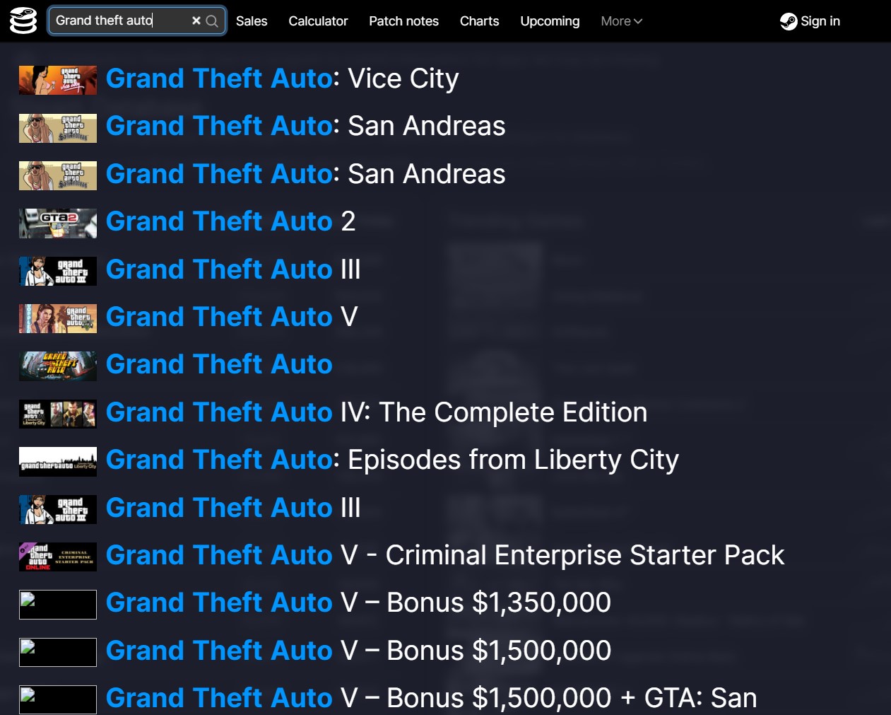 최근 GTA 5는 단품이 사라지고 위와같이 번들 방식 판매만 하고있기 때문에 스팀 DB에서는 제대로 표시되지 않고 있다.