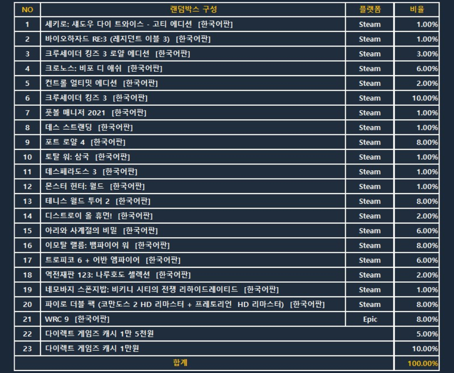 ※ 랜덤 박스 구매 시 랜덤 박스 구성 타이틀 중 1종이 랜덤으로 제공되며, 제품 키 확인 시 타이틀이 확인됩니다.※ 1계정 최대 구매 가능한 수량은 2개이며, 이벤트 상품의 특성상 교환 및 환불