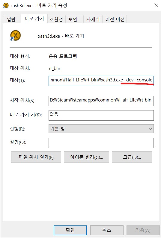 xash3d.exe 우클릭 후 바로가기를 만들고,