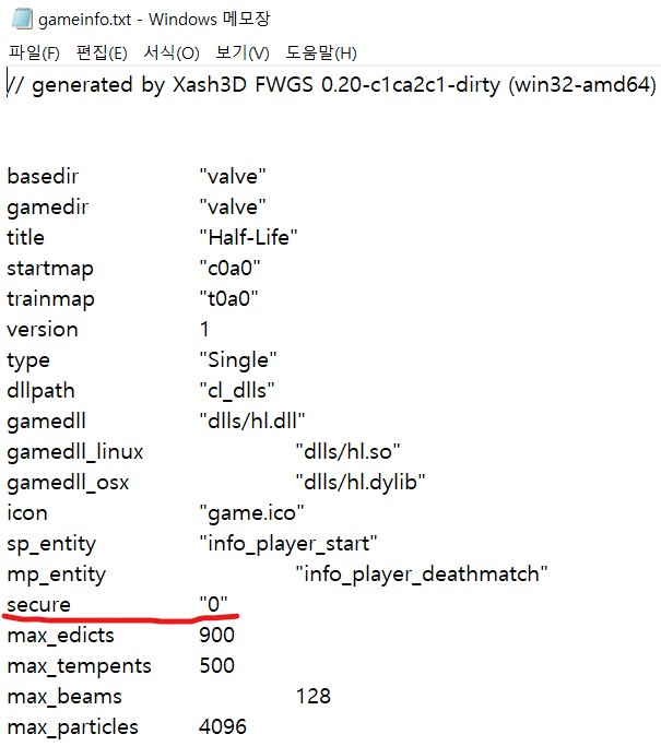 그리고 valve 폴더 안에 있는 gameinfo.txt 파일을 열고 secure 부분을 찾아서 "1"을 "0"으로 만들어주면