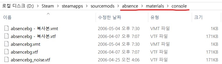 absencebg.vmt 파일과 absencebg.vtf 파일의 복사본을 위 사진처럼 만들어서