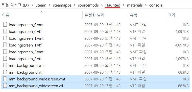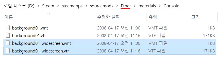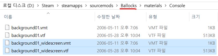 백그라운드 vtf, vmt 파일 복사본 만들고 이름을 '원본이름'_widescreen으로 바꾸기