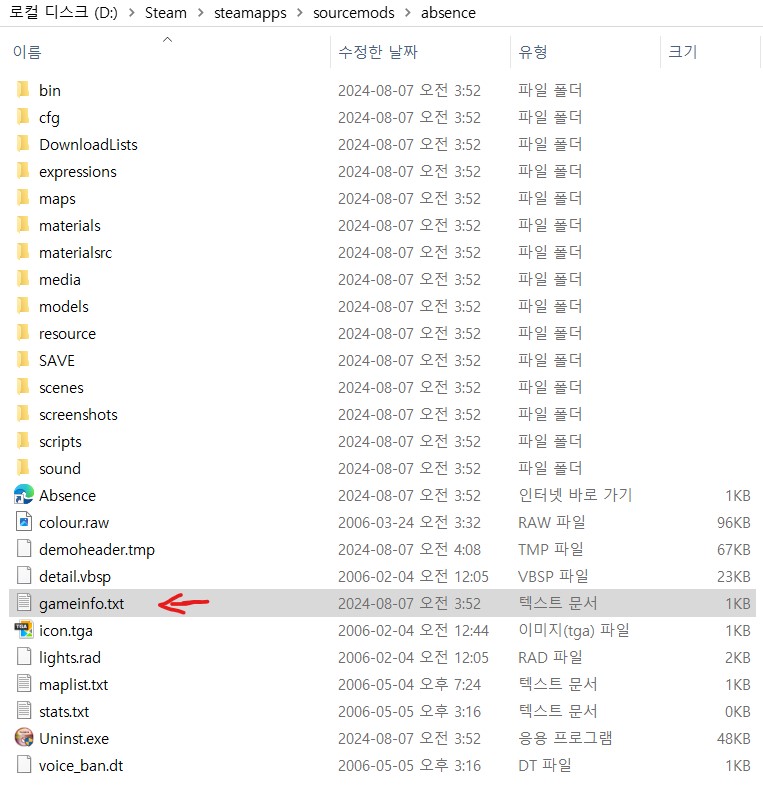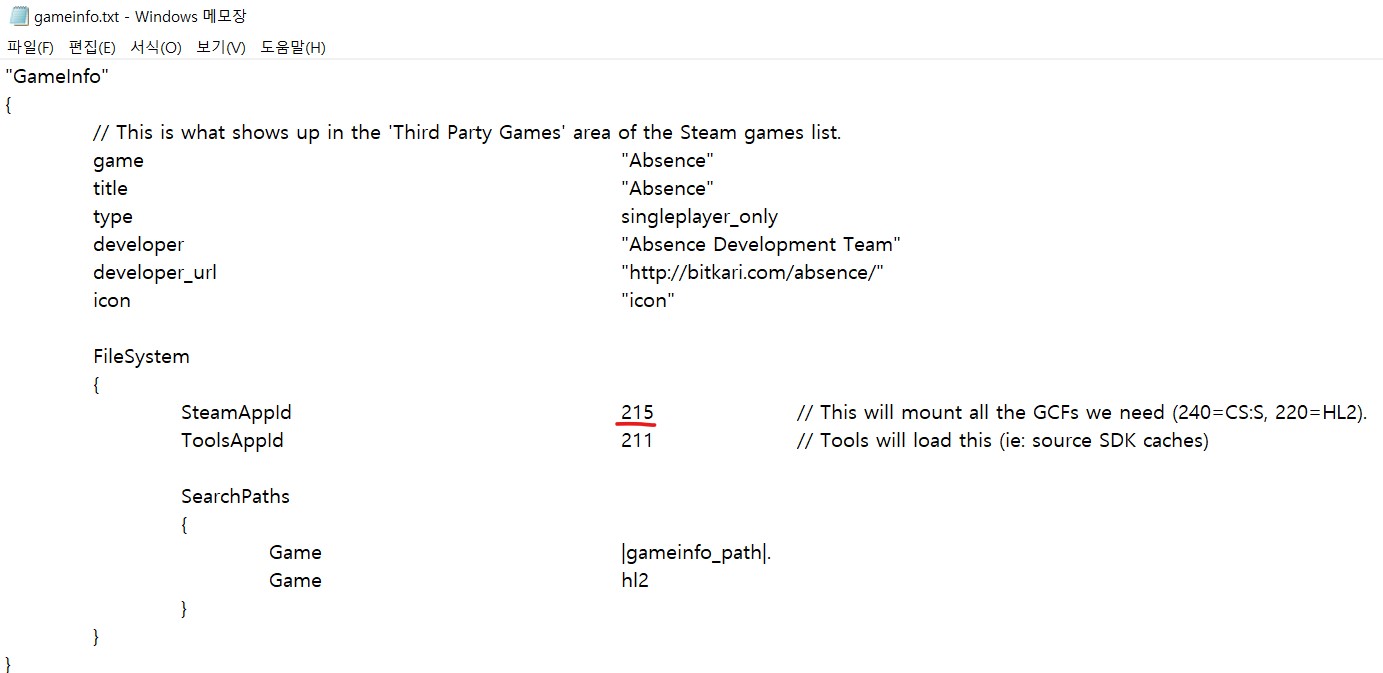 모드 폴더 안에 있는 gameinfo.txt 파일을 열어서 SteamAppId의 숫자를 215로 변경한 후 저장하기