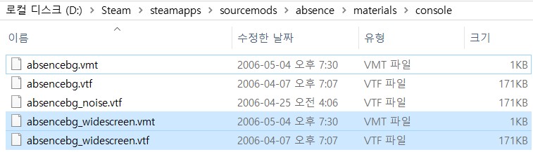 복사본 이름을 absencebg_widescreen.vtf, absencebg_widescreen.vmt 파일로 바꾸면 끝