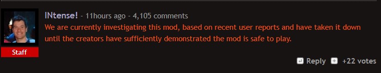 제작자들이 이 모드가 플레이하기에 안전하다는 것을 충분히 입증할 때까지 모드를 내린 상태입니다."