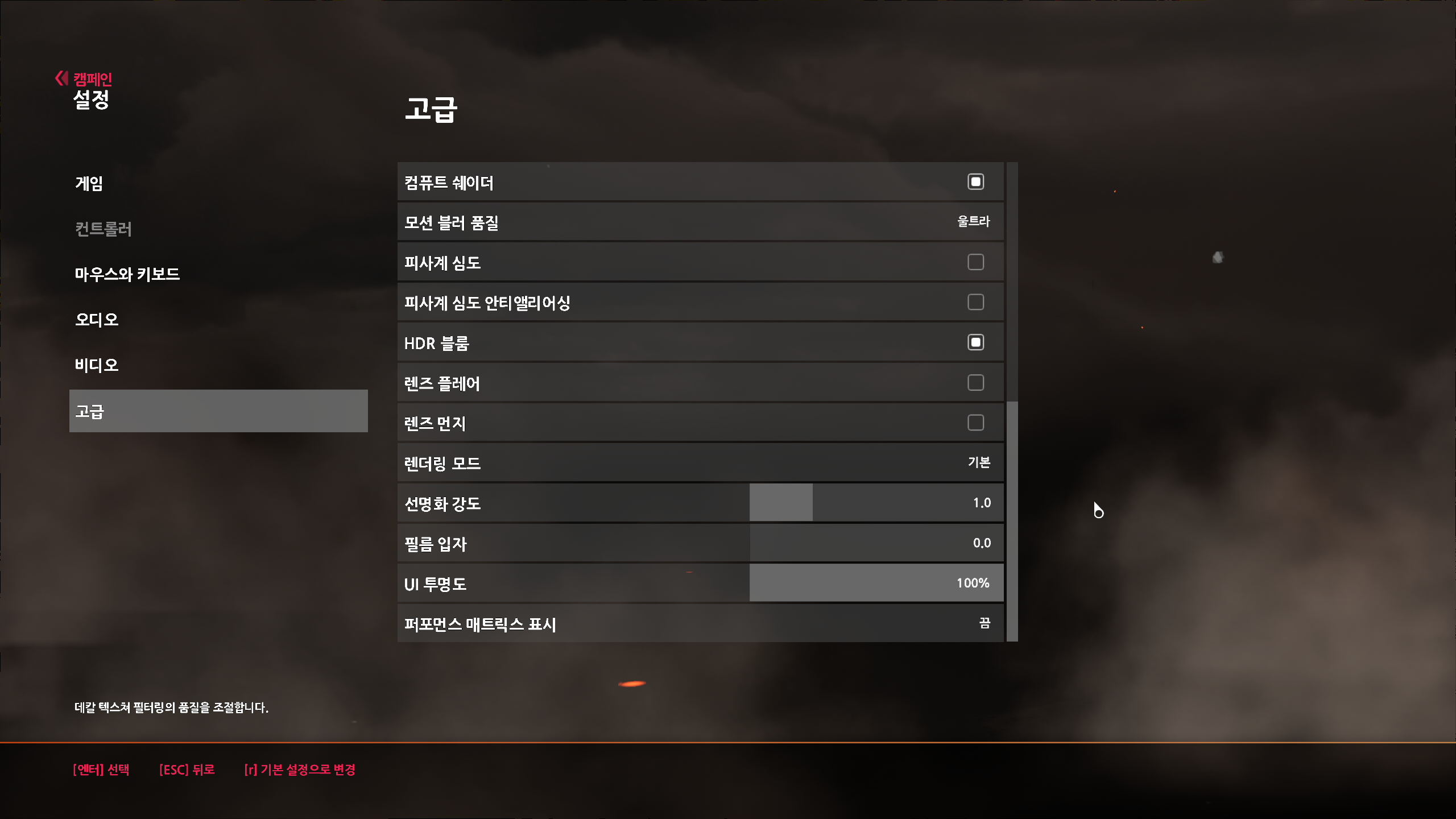 필름 입자 : 성능에 영향 없지만 이 효과는 왜 있는지 모르겠음. 영향 없어도 개인적으로 끄는걸 추천