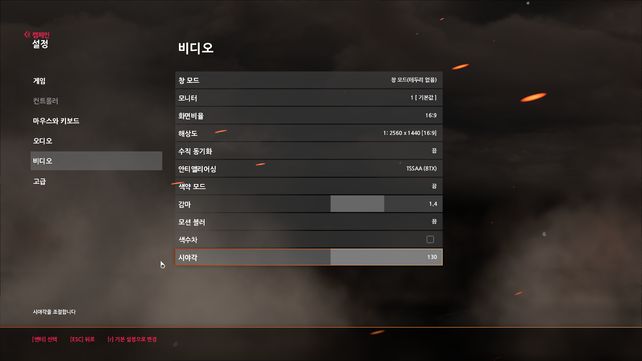 시야각 (FOV) : 이것도 최소와 최대 값을 비교해보면 FPS 차이가 4~7 프레임 정도 난다고 함. FPS 멀미 심한거 아니면 평균값 90 추천