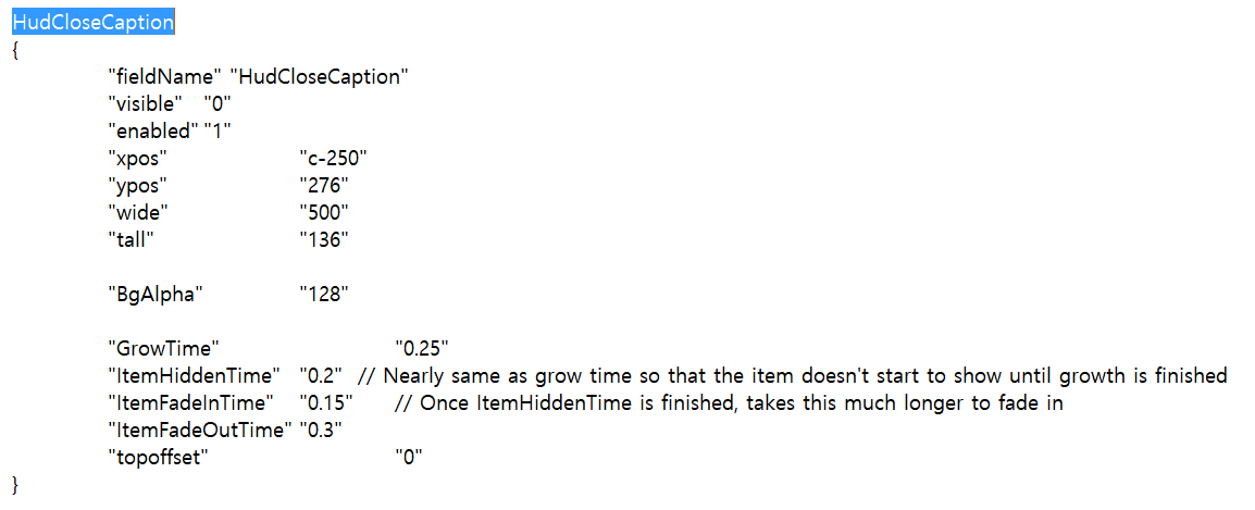 그리고 hudlayout.res 파일을 메모장으로 열고 Ctrl + F 로 HudCloseCaption 을 찾는다.