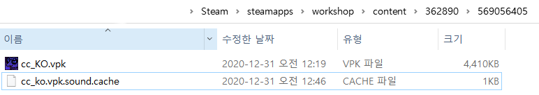 이렇게 cc_KO.vpk 파일이 나온다. 이제 한글 패치 창작모드를 구독했다면 그 이후에 있는 설명 따라서 설치하면 끝.
