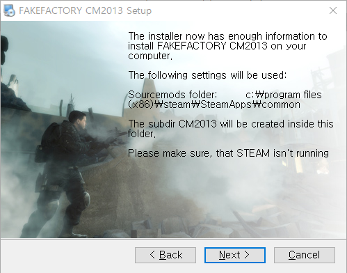설치 창이 닫히고 나면 또 이런 설치창이 뜨는데, 이건 하프라이프 2가 설치된 폴더로 지정되어 있는게 정상이다.