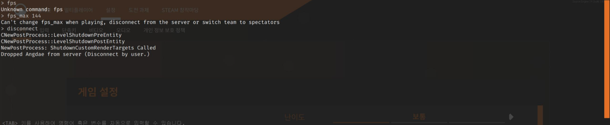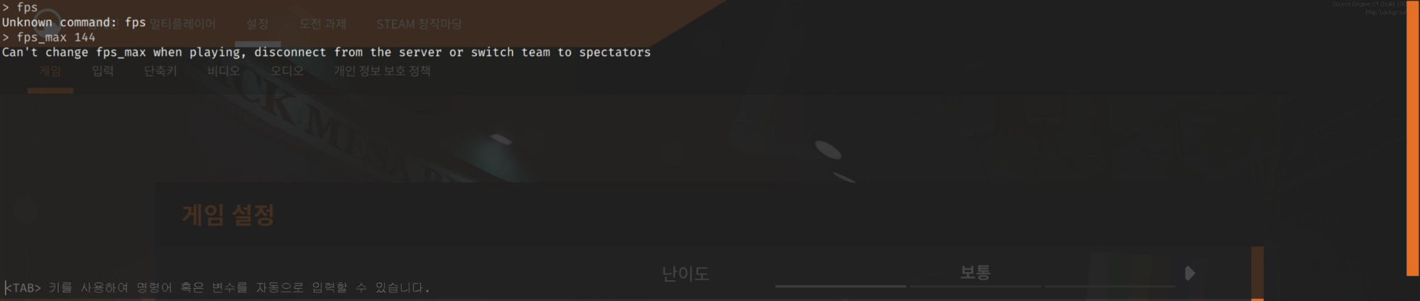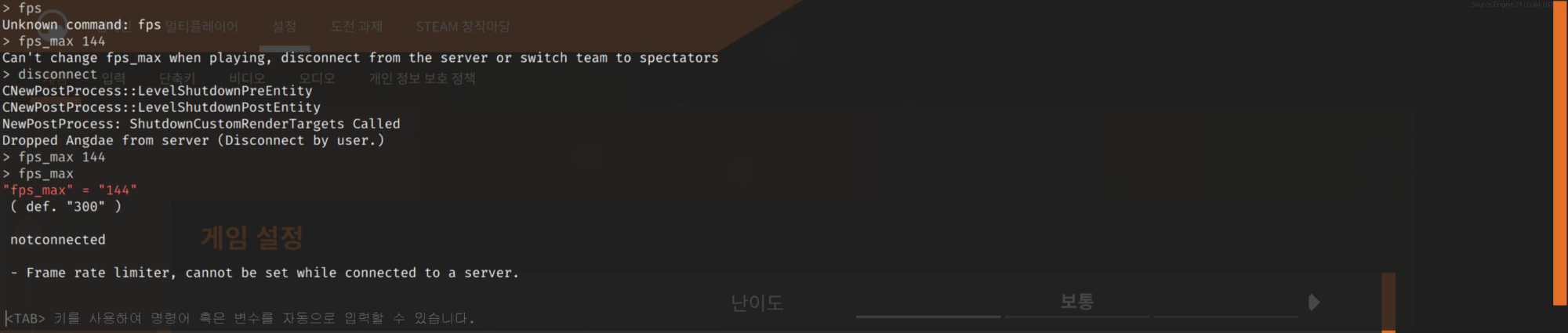 시작 옵션에 +fps_max '원하는 값' 을 입력 후 게임을 실행해서 콘솔 창에 fps_max를 입력해보면 프레임이 원하는 값으로 고정된 것을 확인할 수 있다.
