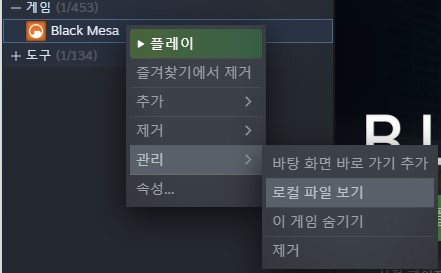 스팀 라이브러리에서 블랙 메사 아이콘 우클릭 → 관리 → 로컬 파일 보기를 눌러서 게임이 설치된 폴더로 이동한다.