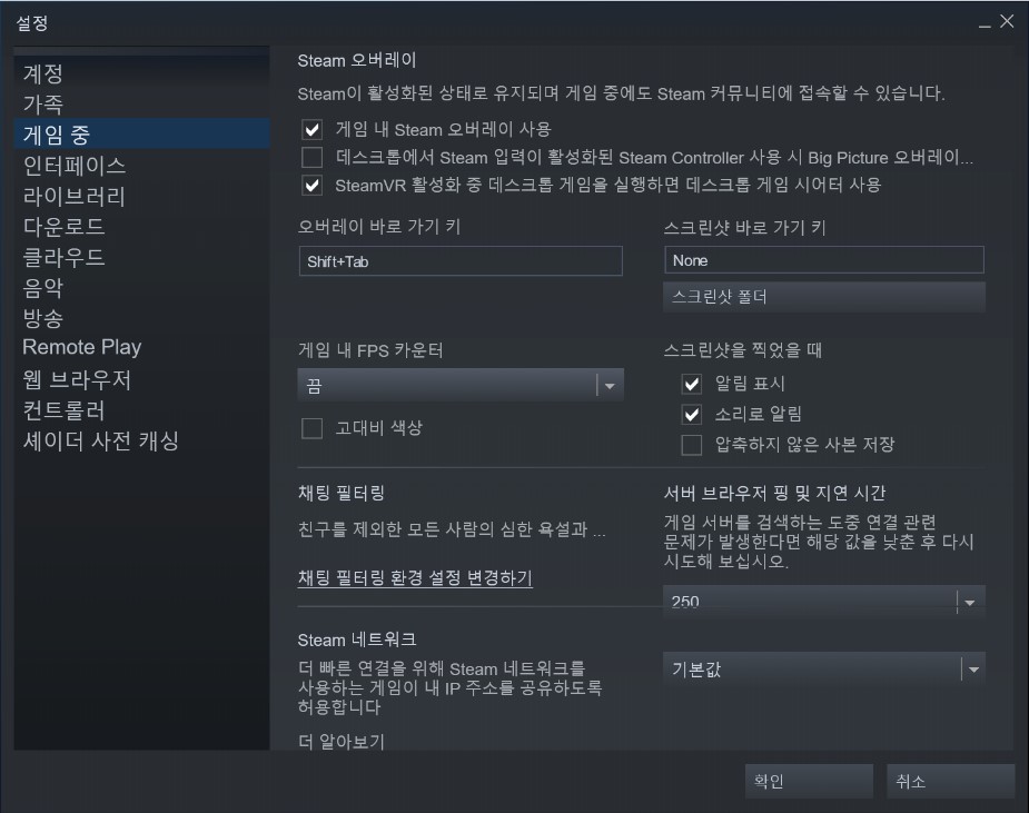(스팀 창이 켜져있다면 스팀 창 좌측 상단 Steam 누르고 설정 들어가면 됨)
