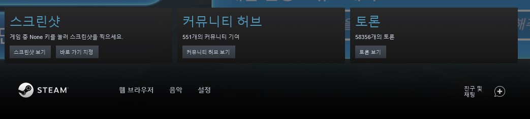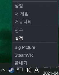 먼저 좌측 하단 작업표시줄에서 스팀 아이콘을 클릭 또는 우클릭해서 위 스샷과 같은 창을 띄운 뒤