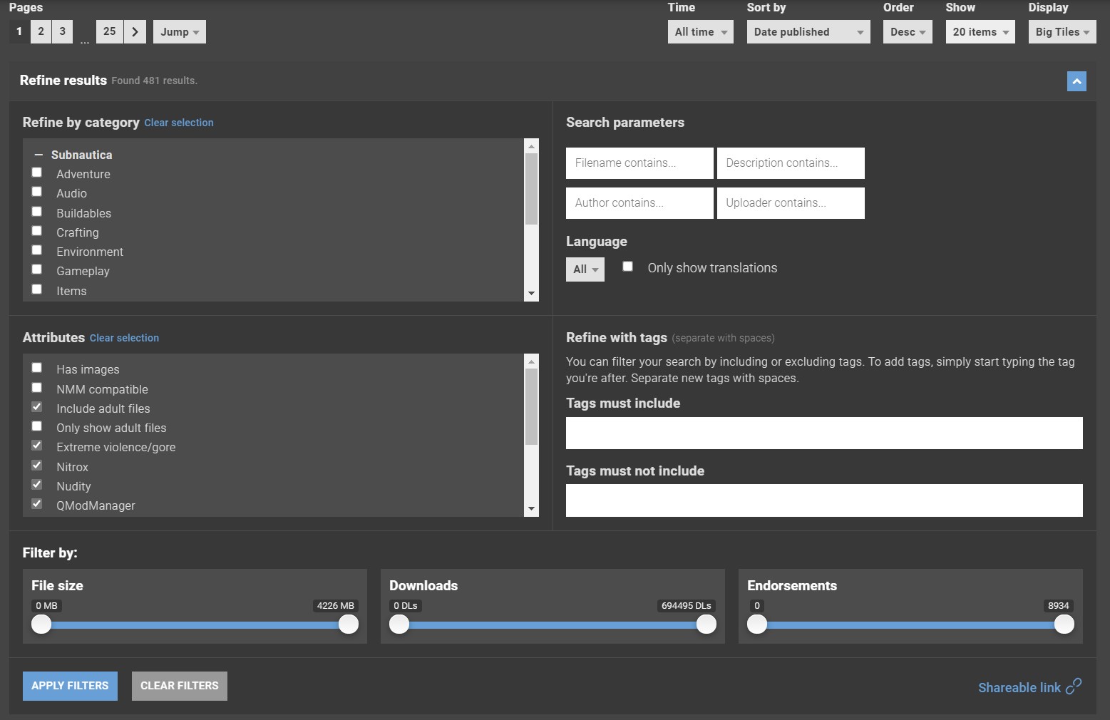 상단에 있는 Refine results를 클릭해서 카테고리별로 검색 하거나 특정 태그를 포함 또는 제외시키고 검색을 할 수도 있는데 서브노티카 모드 갯수가 스카이림이나 폴아웃 급으로 많지는 않기 때문에