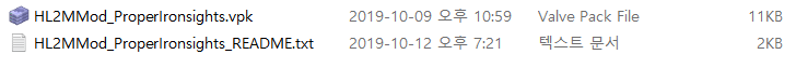 MMod 파일을 압축 풀었을때 나오는 Extra! 폴더 안에 HL2MMod_ProperIronsights.vpk 파일을 해당 게임의 Custom 폴더 안에 넣으면 된다.