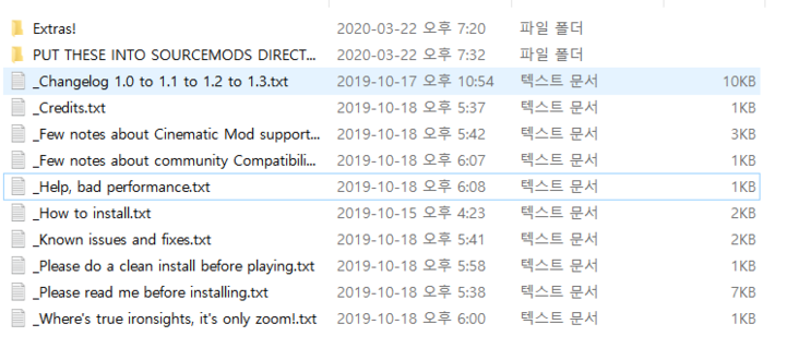 그 다음 압축은 아무데나 풀고, PUT THESE INTO SOURCEMODS DIRECTORY 폴더 안에 있는 폴더들을 전부 복사 한 뒤